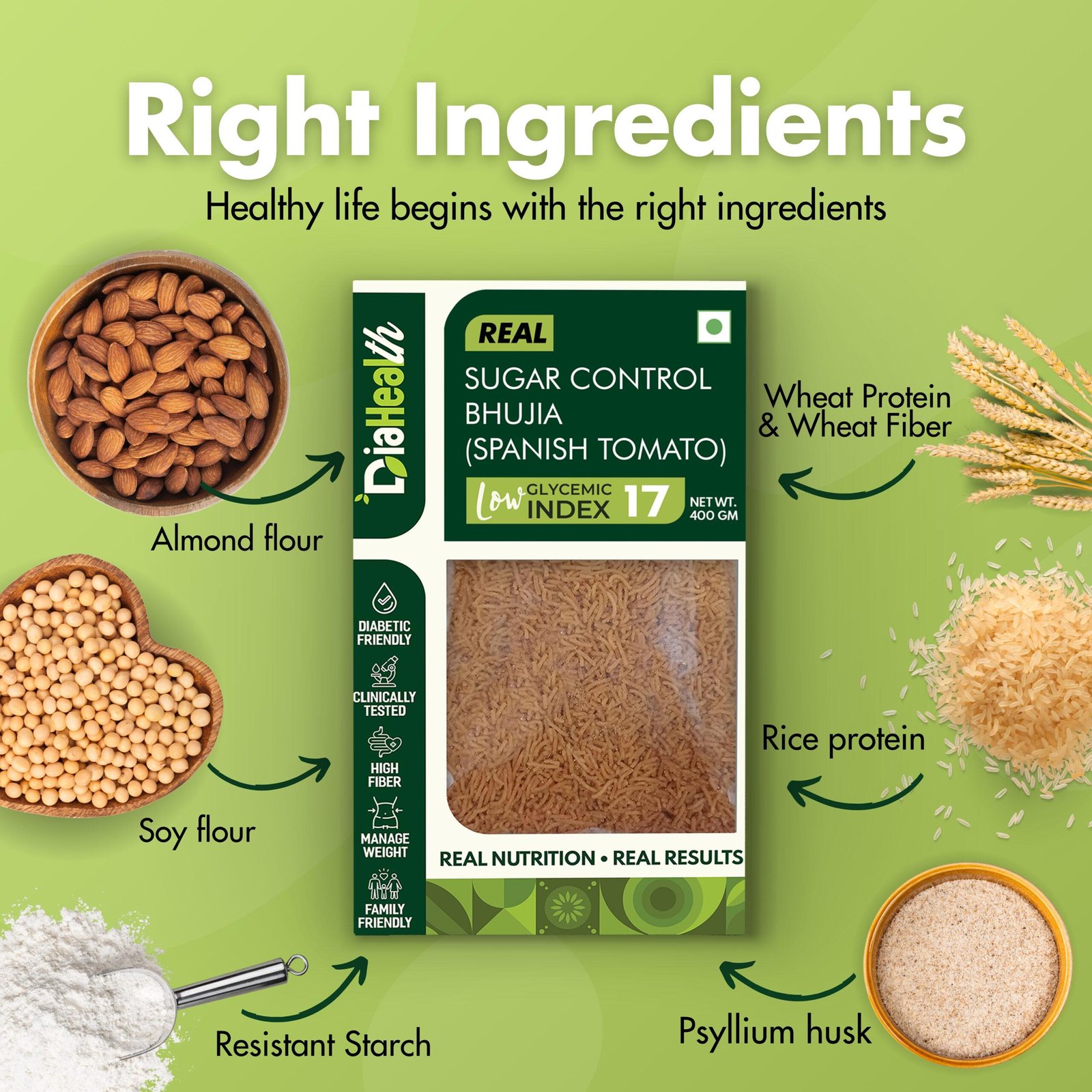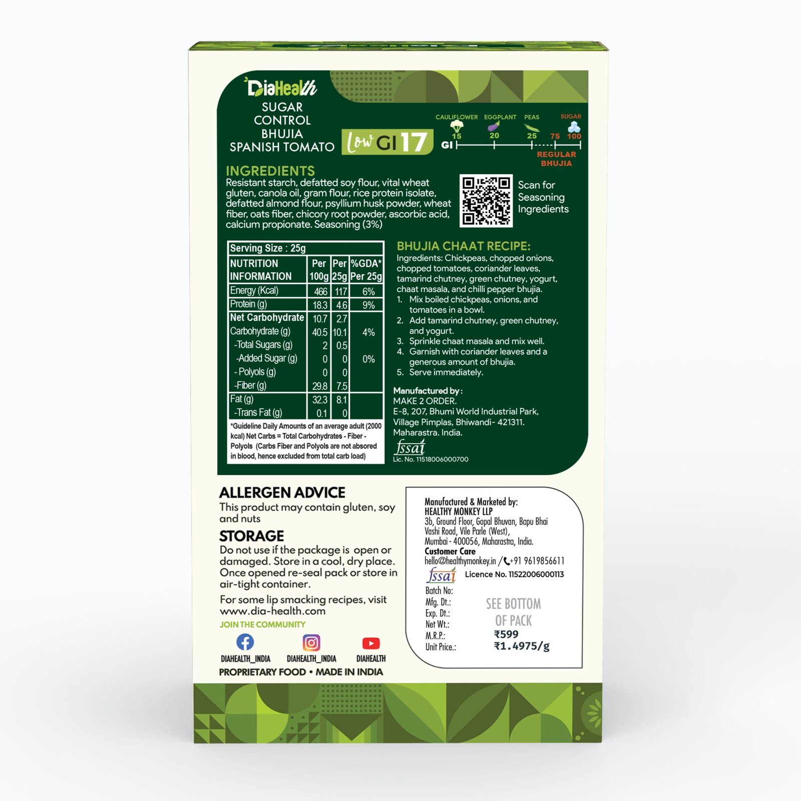 • TASTE IDENTICAL : Diahealth Sugar Control Bhujia (Spanish Tomato) is taste Identical to Regular Bhujia. We work hard to ensure that you can enjoy yourself even on a low-carb lifestyle without compromising on taste.