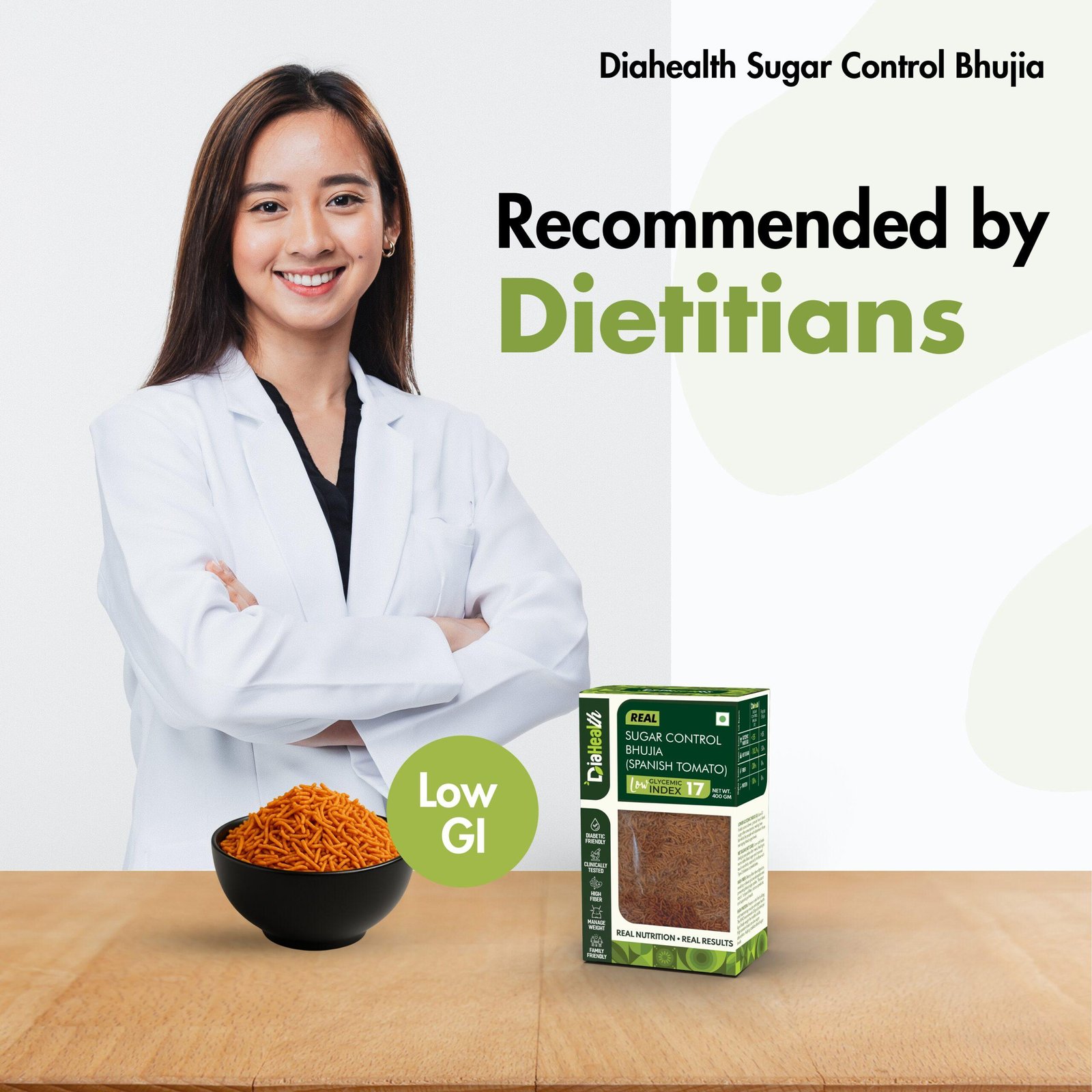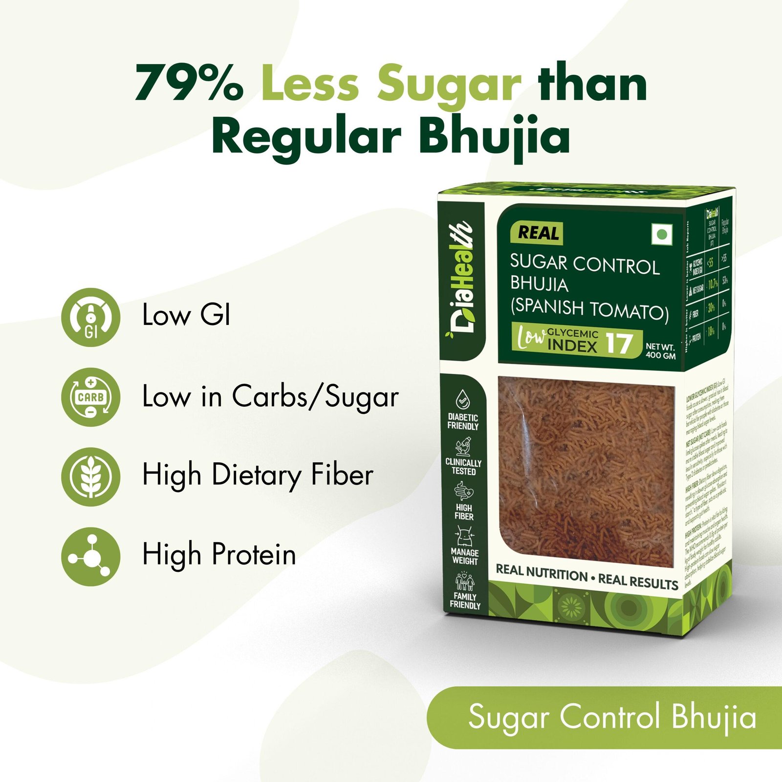 • DIABETIC-FRIENDLY & LOW GLYCEMIC INDEX: With a glycemic index of just , Diahealth Sugar Control Bhujia (Spanish Tomato) is ideal for diabetics and pre-diabetics. It supports stable blood sugar levels, making it a must-have for those following Low GI or low-calorie diets without compromising on taste.