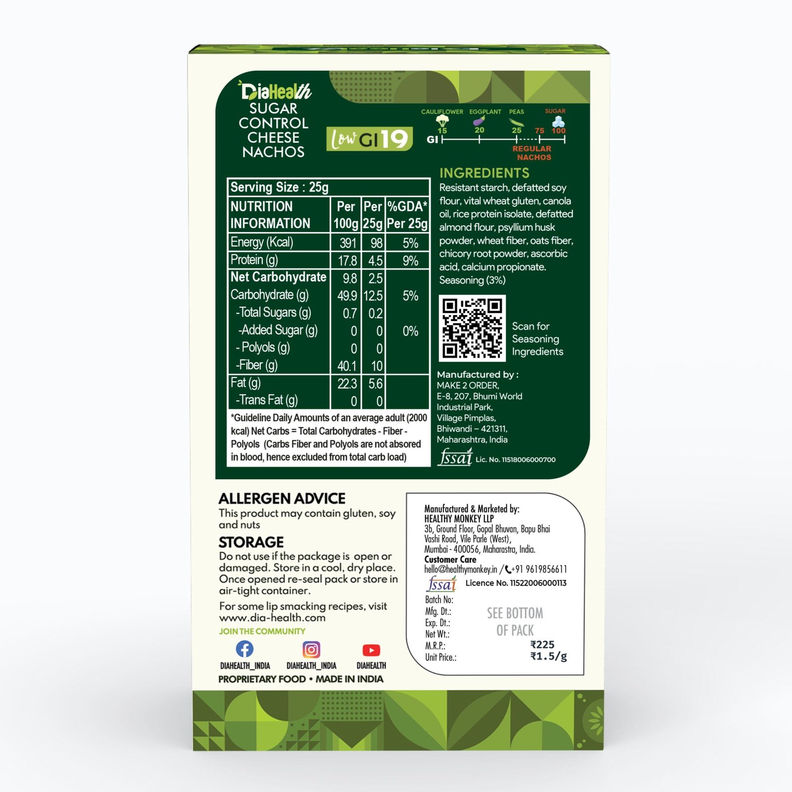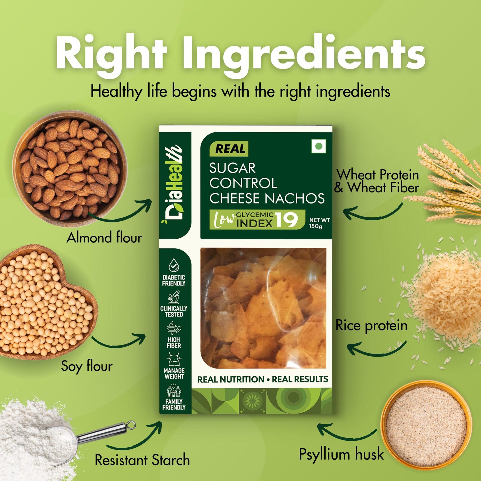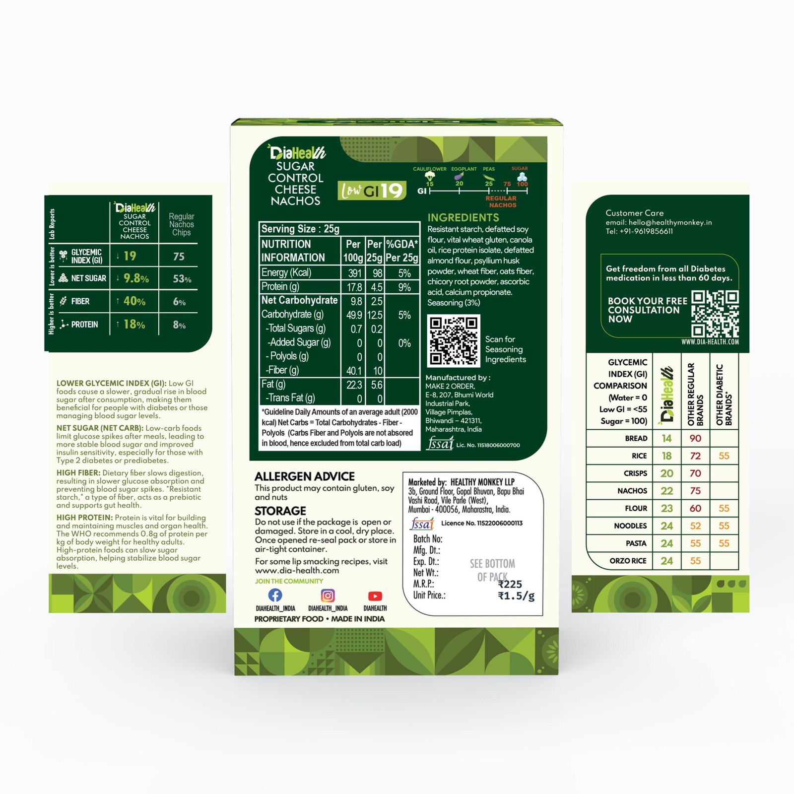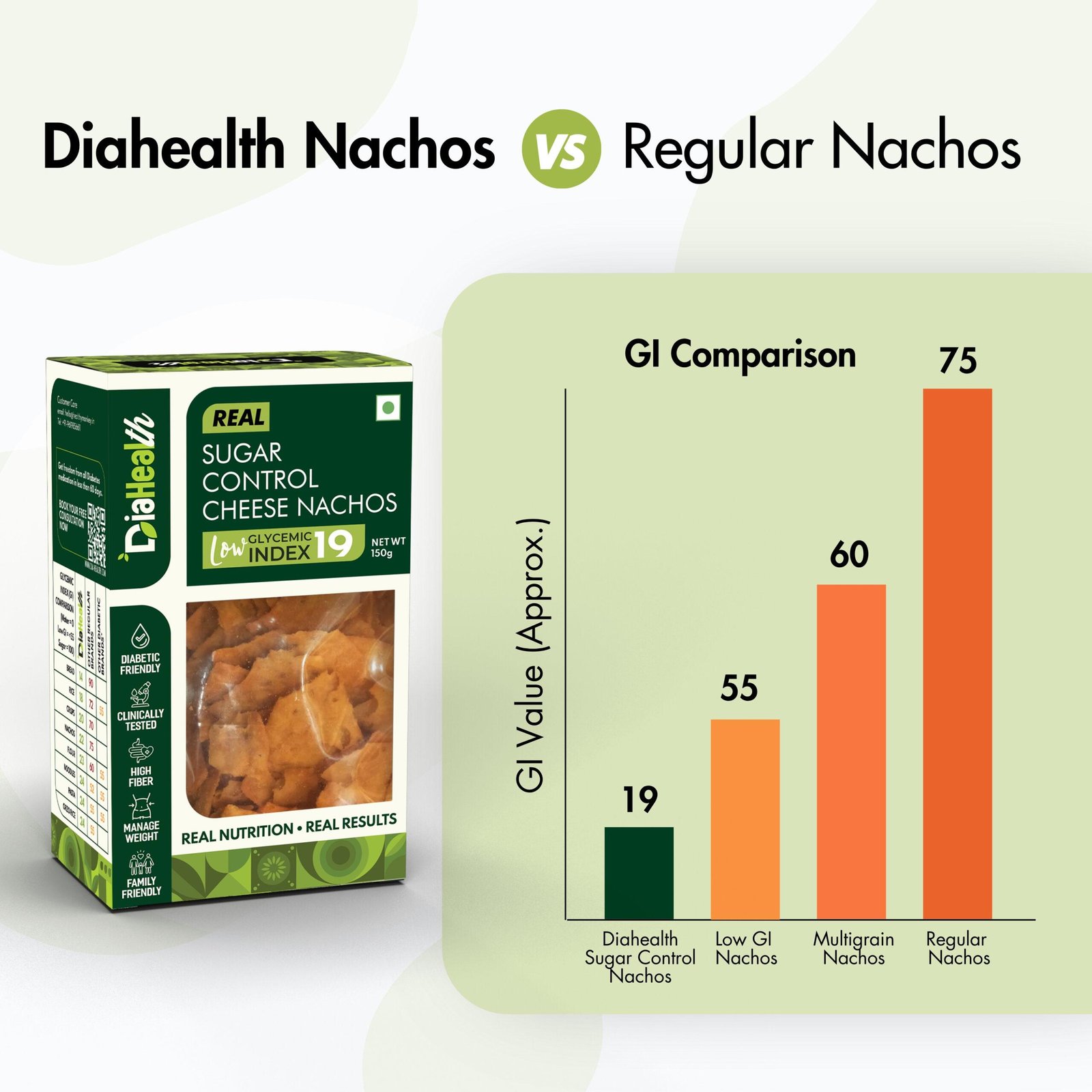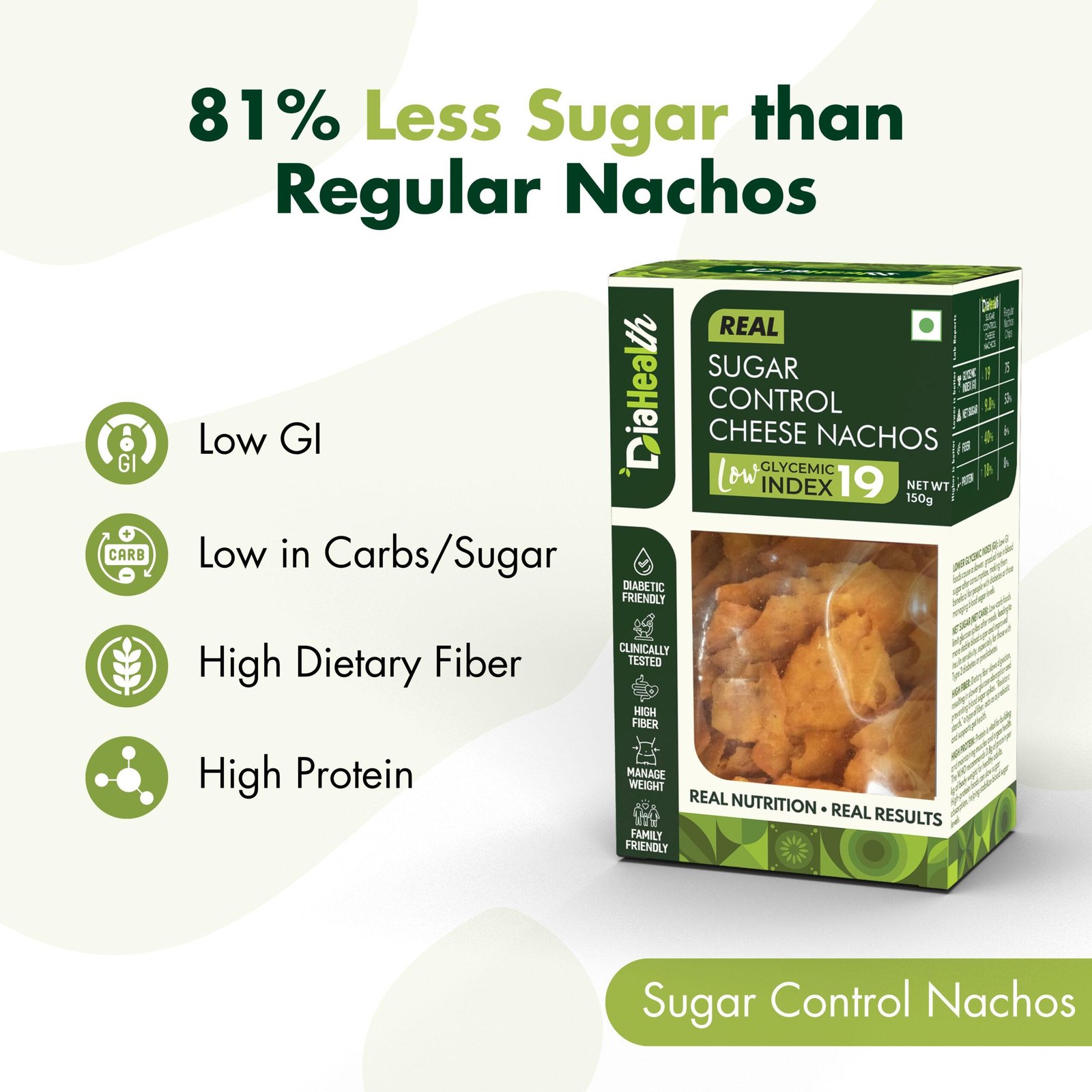 - DIABETIC-FRIENDLY & LOW GLYCEMIC INDEX: With a glycemic index of just 19, Diahealth Sugar Control Cheese Nachos is ideal for diabetics and pre-diabetics. It supports stable blood sugar levels, making it a must-have for those following Low GI or low-calorie diets without compromising on taste.