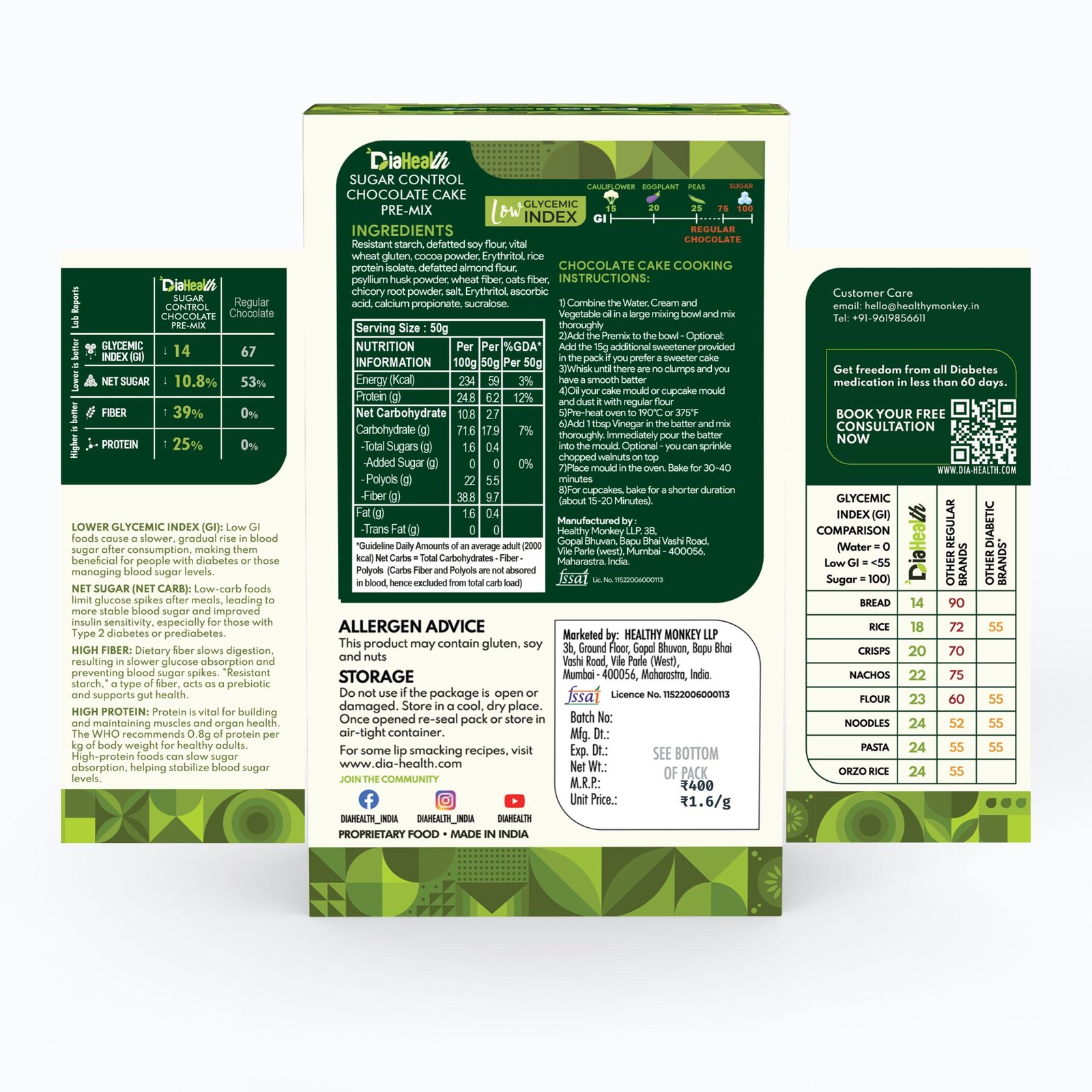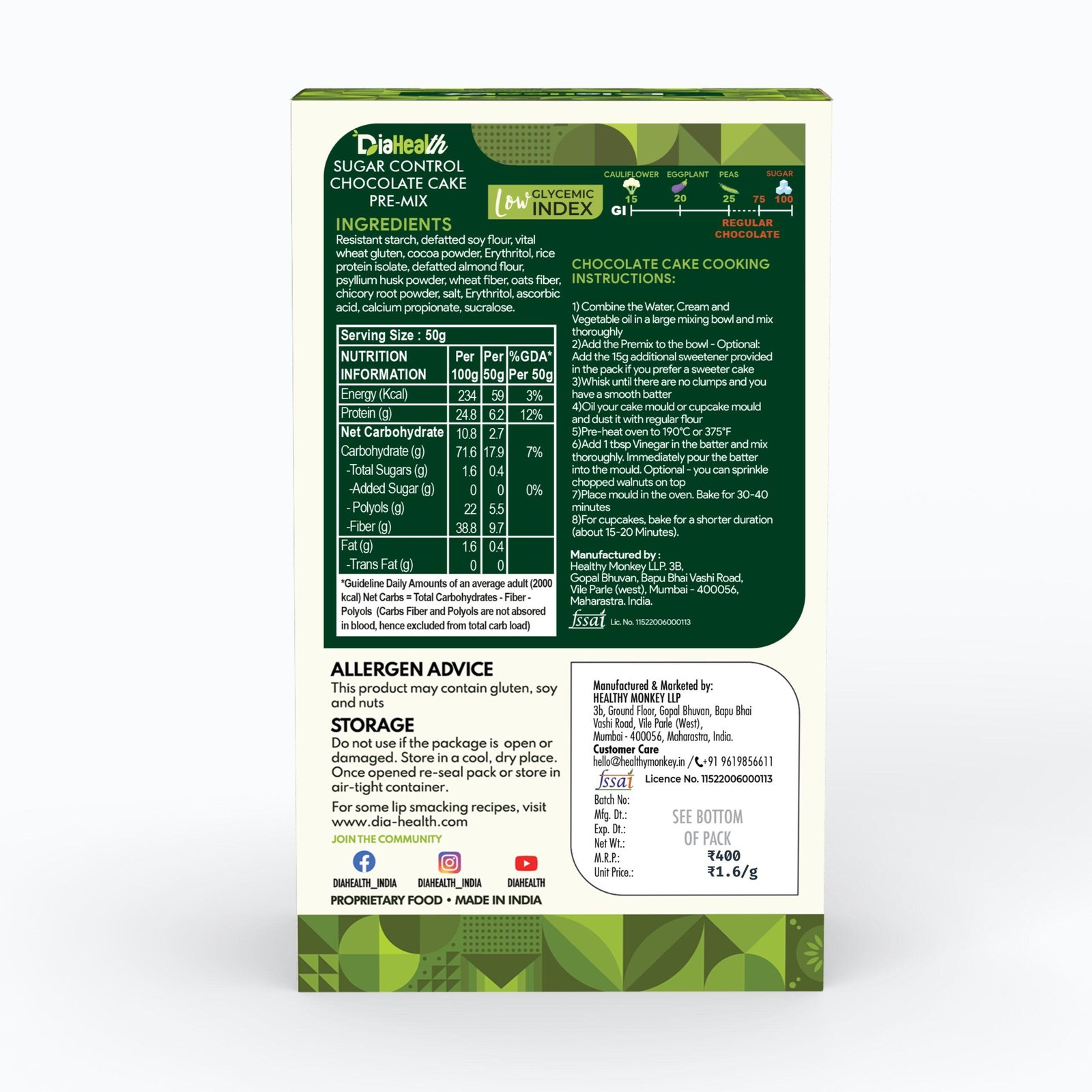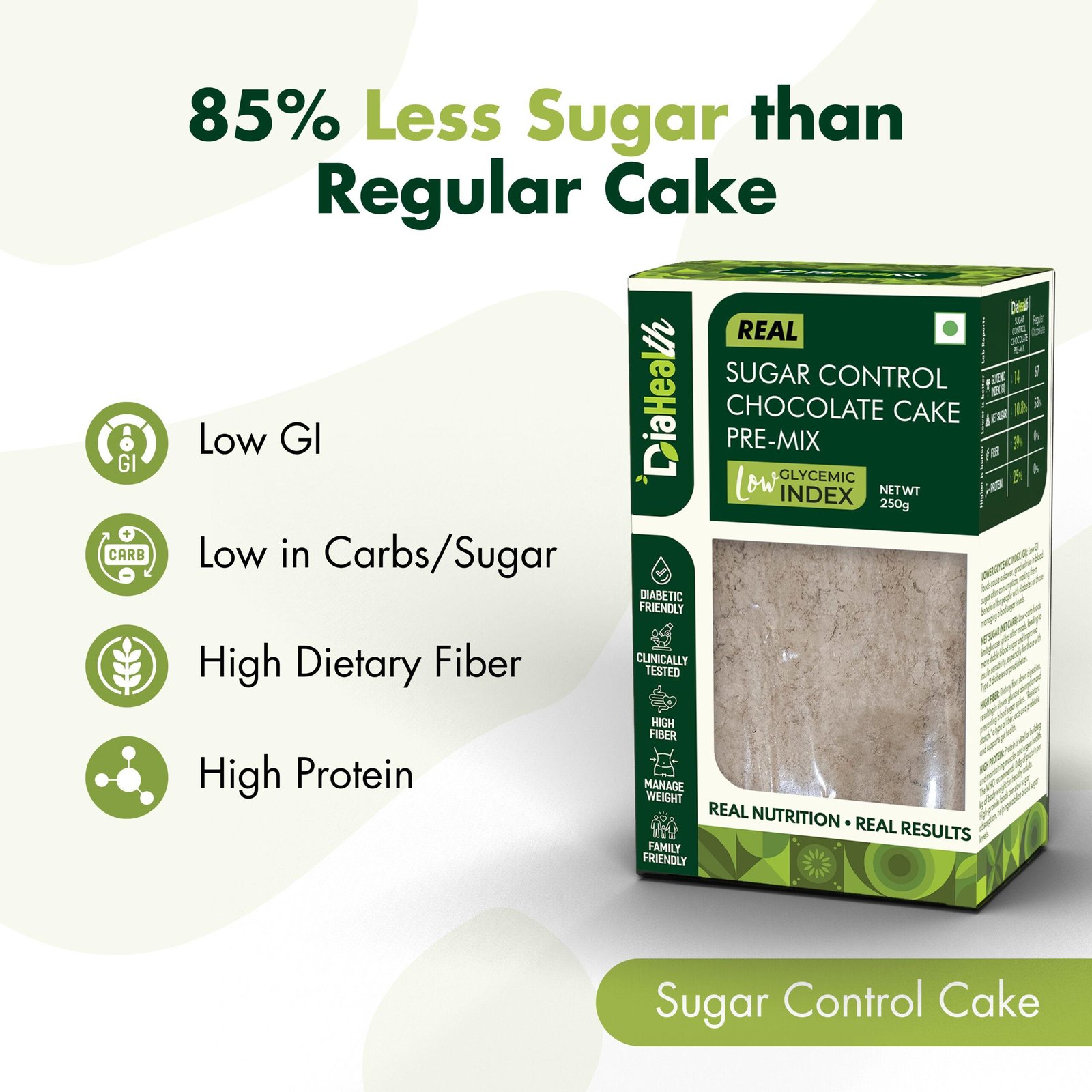 • DIABETIC-FRIENDLY & LOW GLYCEMIC INDEX: With a glycemic index of just , Diahealth Sugar Control Chocolate Cake Premix is ideal for diabetics and pre-diabetics. It supports stable blood sugar levels, making it a must-have for those following Low GI or low-calorie diets without compromising on taste.