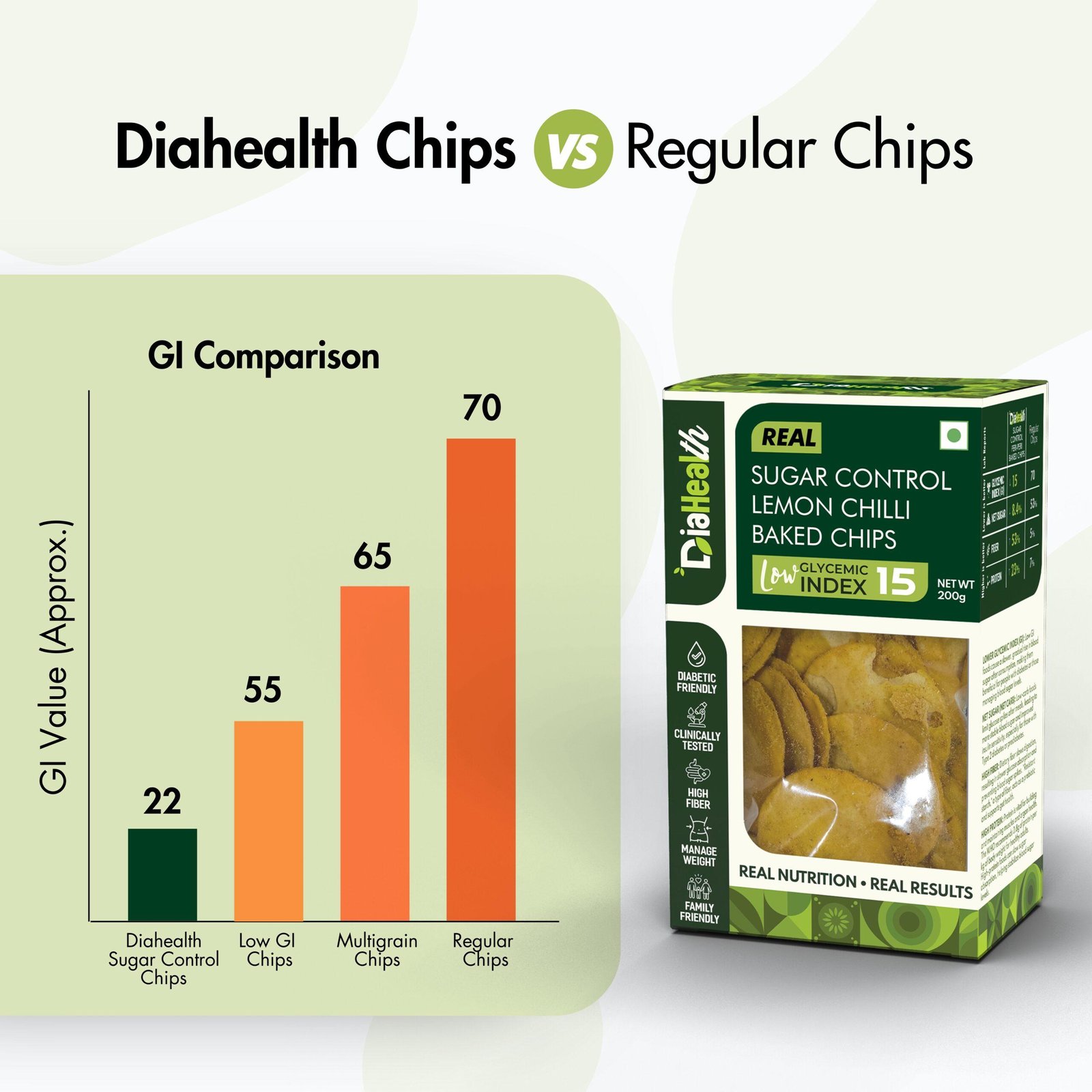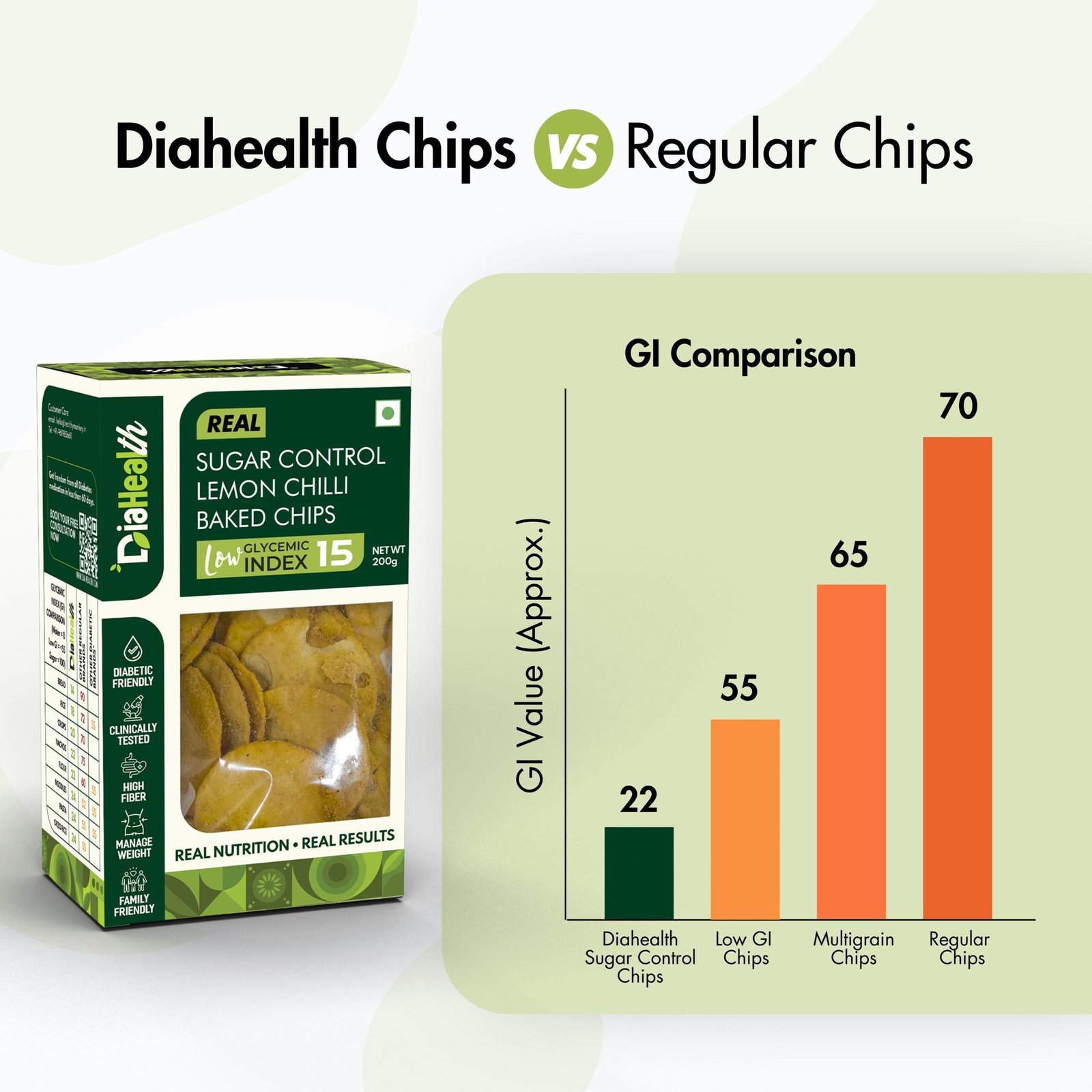 - TASTE IDENTICAL : Diahealth Sugar Control Lemon Chilli Baked Chips is taste Identical to Regular Chips. We work hard to ensure that you can enjoy yourself even on a low-carb lifestyle without compromising on taste.