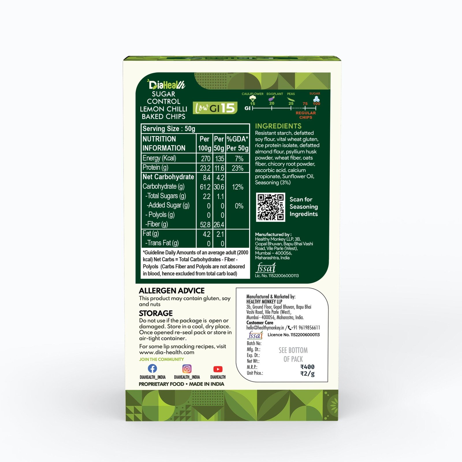 - PERFECT FOR DIABETICS & KETO : Diahealth Sugar Control Lemon Chilli Baked Chips has just 15 Carbs and does not affect blood sugar and insulin levels. This makes it an ideal Sugar Control Lemon Chilli Baked Chips replacement for diabetics and those following KETO, LOW-CARB & LOW-CALORIE DIETS.