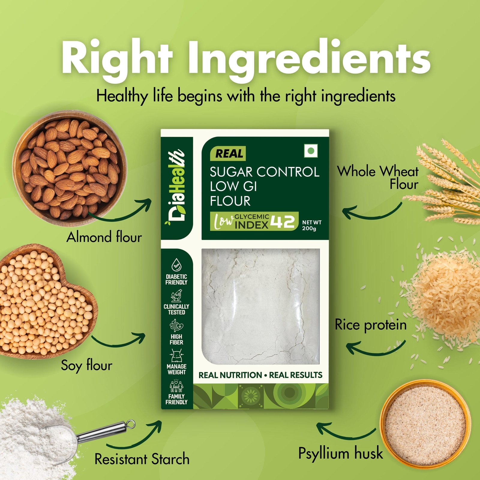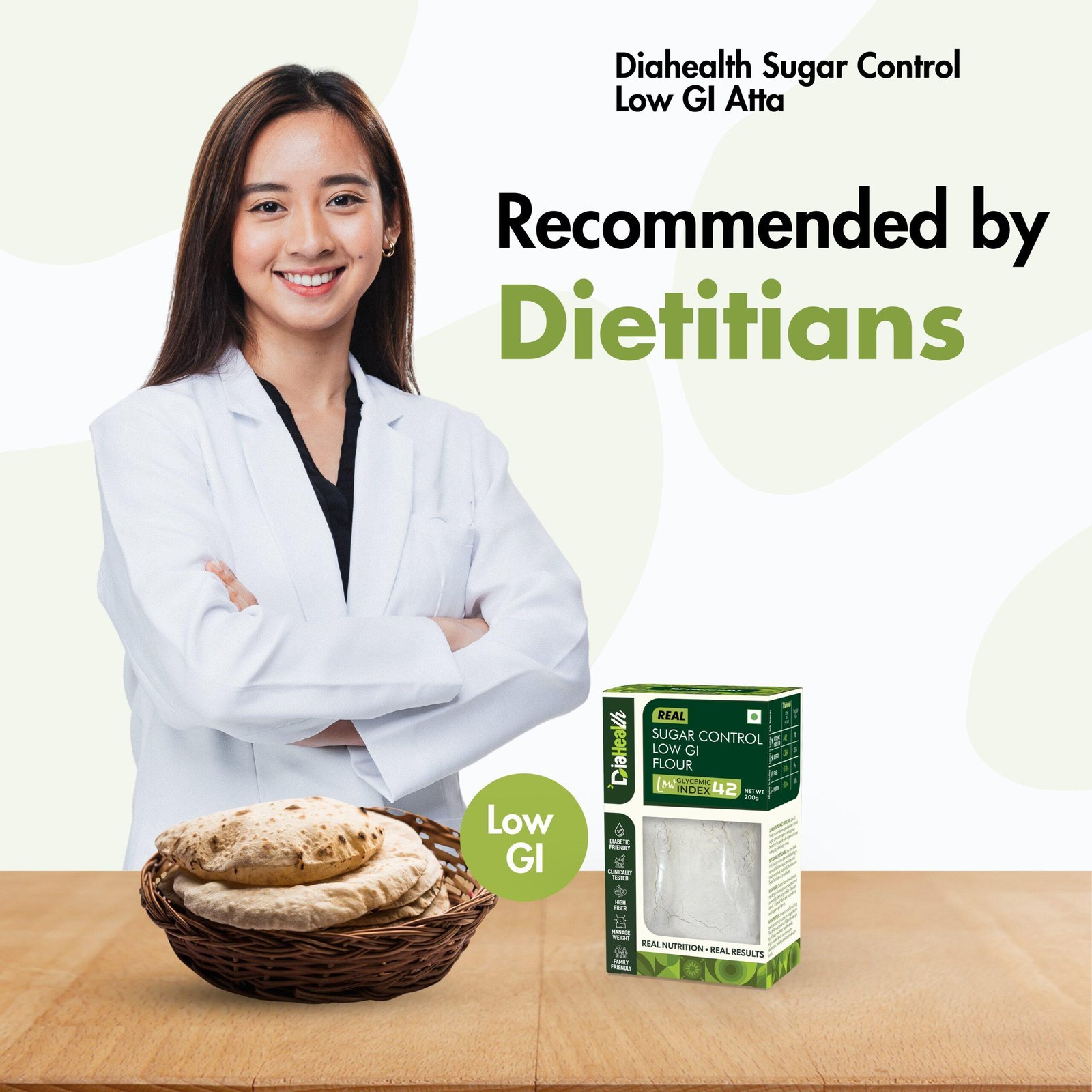 - About Diahealth Atta: Diahealth Sugar Control Low GI Atta is a revolutionary flour that tastes just like wheat atta but is 10x healthier. With a low glycemic index, high protein, fiber, and minimal fat, it supports diabetic-friendly, weight-loss, and Low GI diets while promoting gut health. Enjoy guilt-free meals like chapatis, parathas, and baked goods without compromising on taste or nutrition.