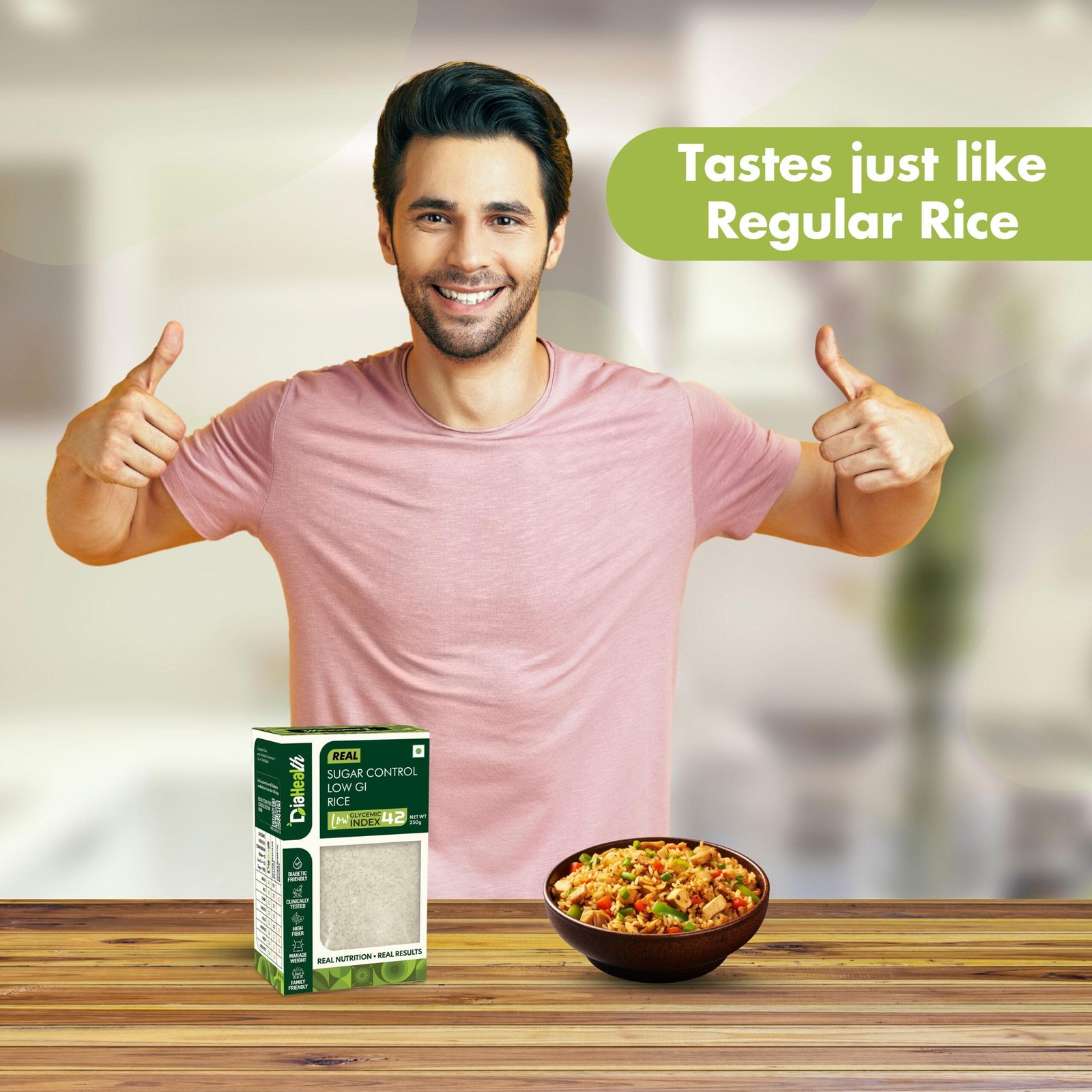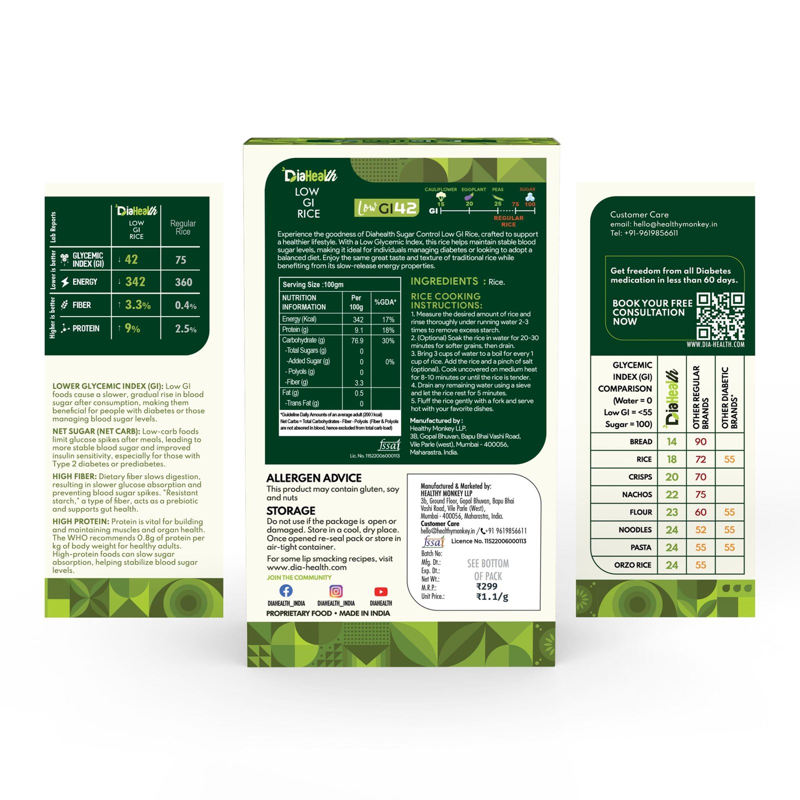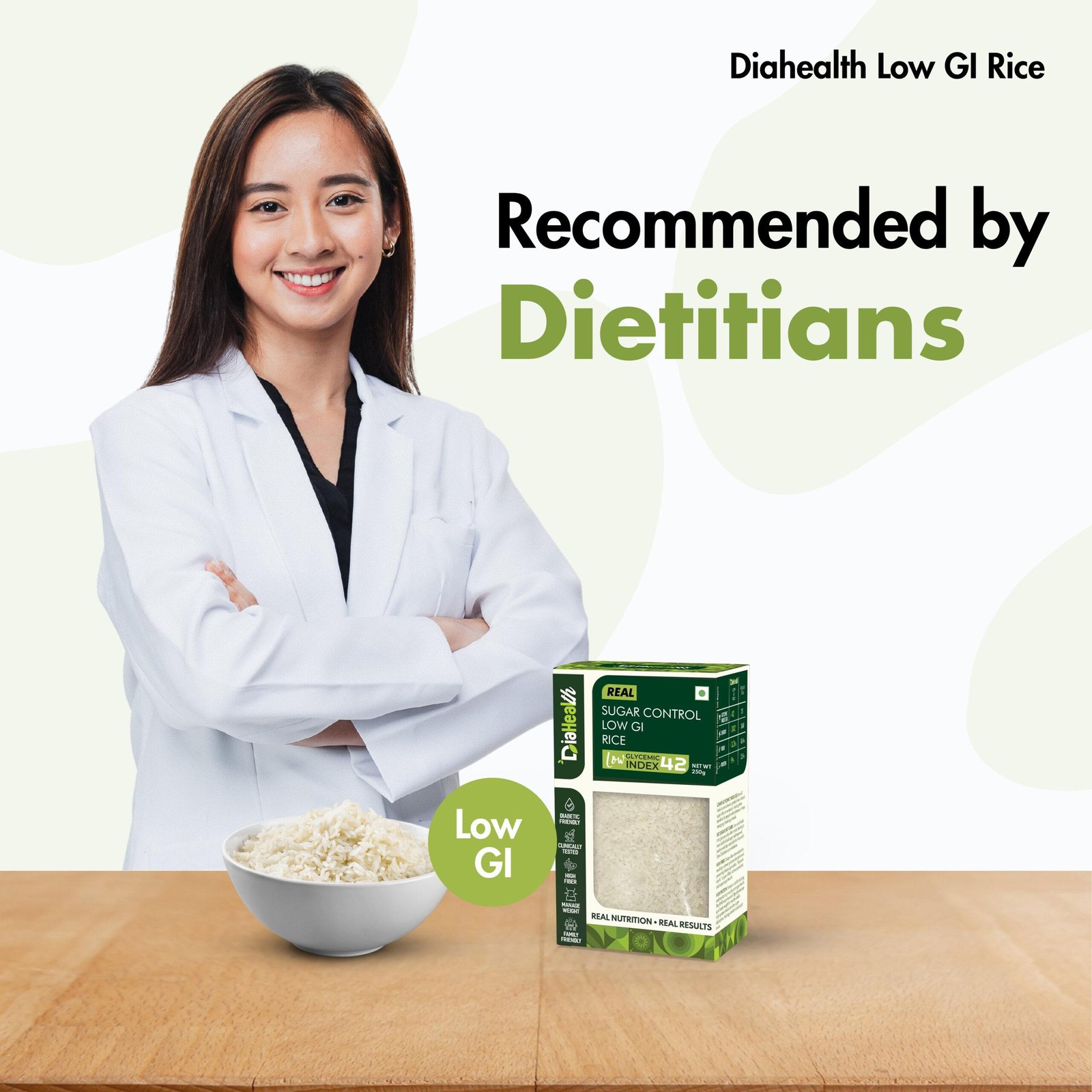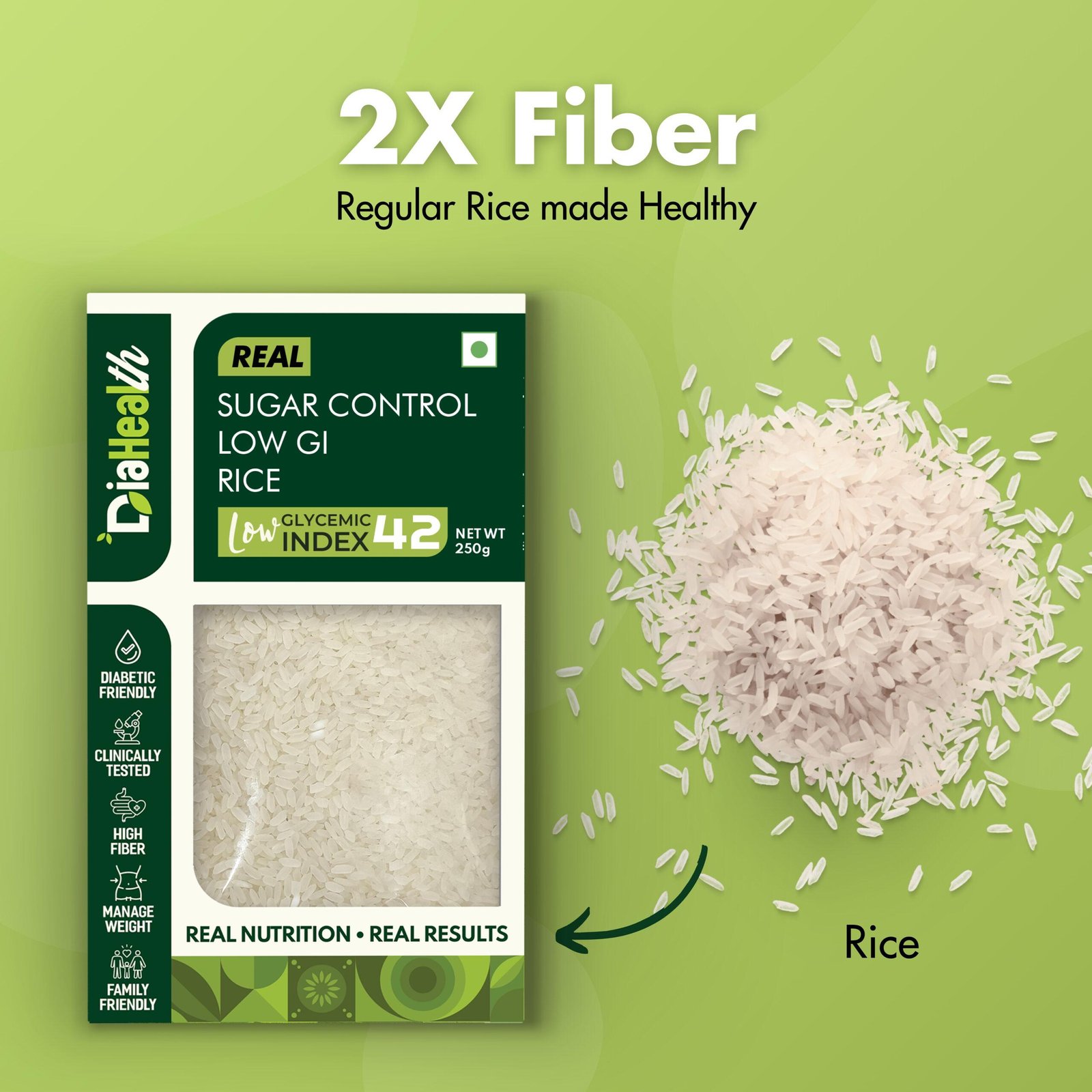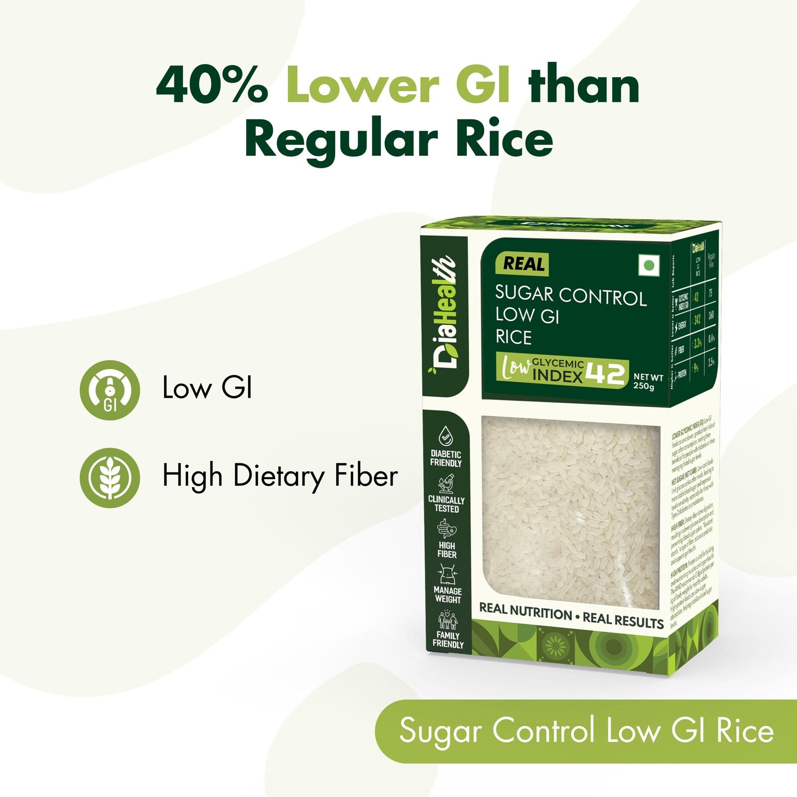 - About Diahealth Rice: Diahealth Sugar Control Low GI Rice is a revolutionary rice that tastes just like regular rice but much healthier. With a low glycemic index, high protein, fiber, and minimal fat, it supports diabetic-friendly, weight-loss, and Low GI diets while promoting gut health. Enjoy guilt-free meals like chapatis, parathas, and baked goods without compromising on taste or nutrition.