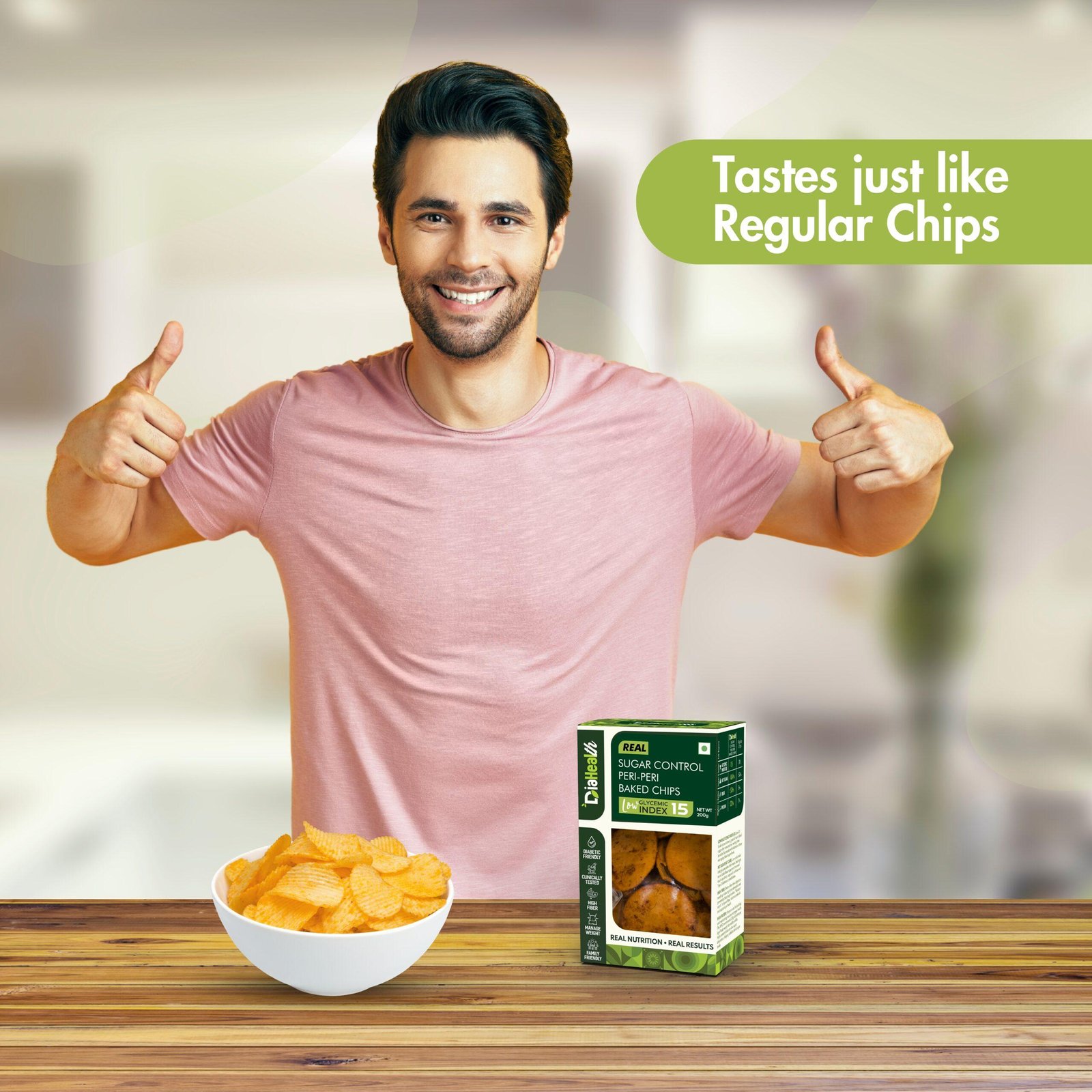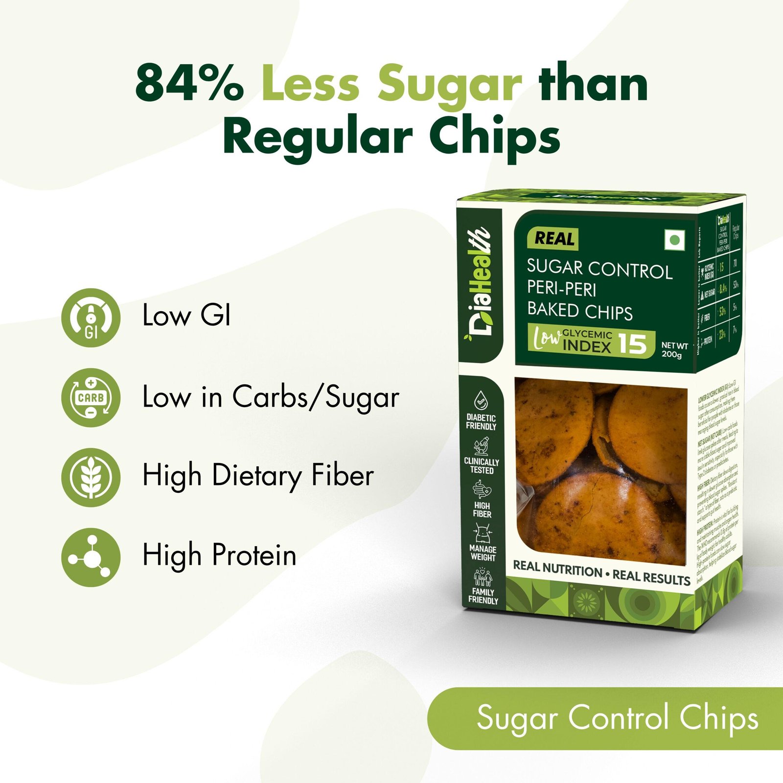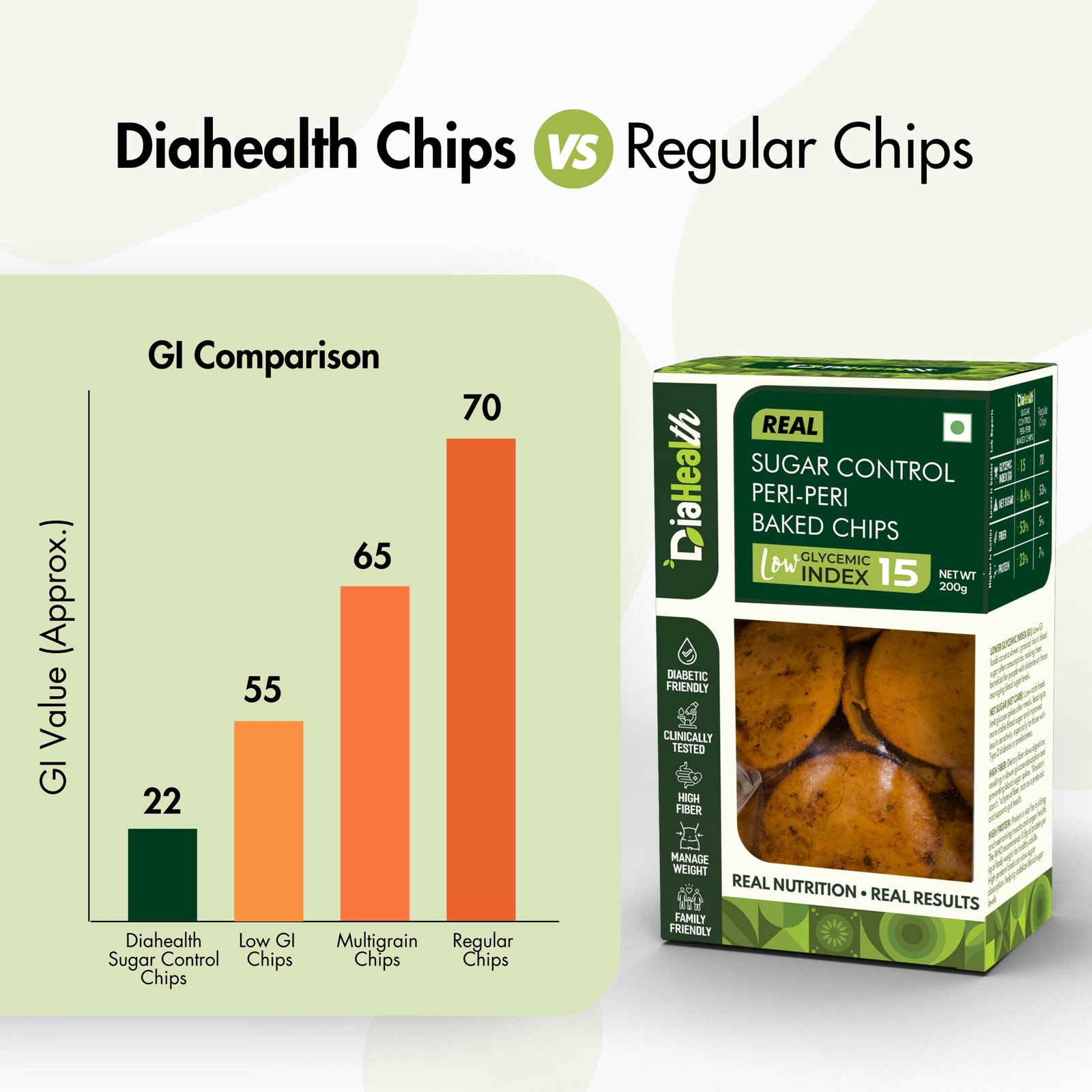 - TASTE IDENTICAL : Diahealth Sugar Control Peri-Peri Baked Chips is taste Identical to Regular Chips. We work hard to ensure that you can enjoy yourself even on a low-carb lifestyle without compromising on taste.