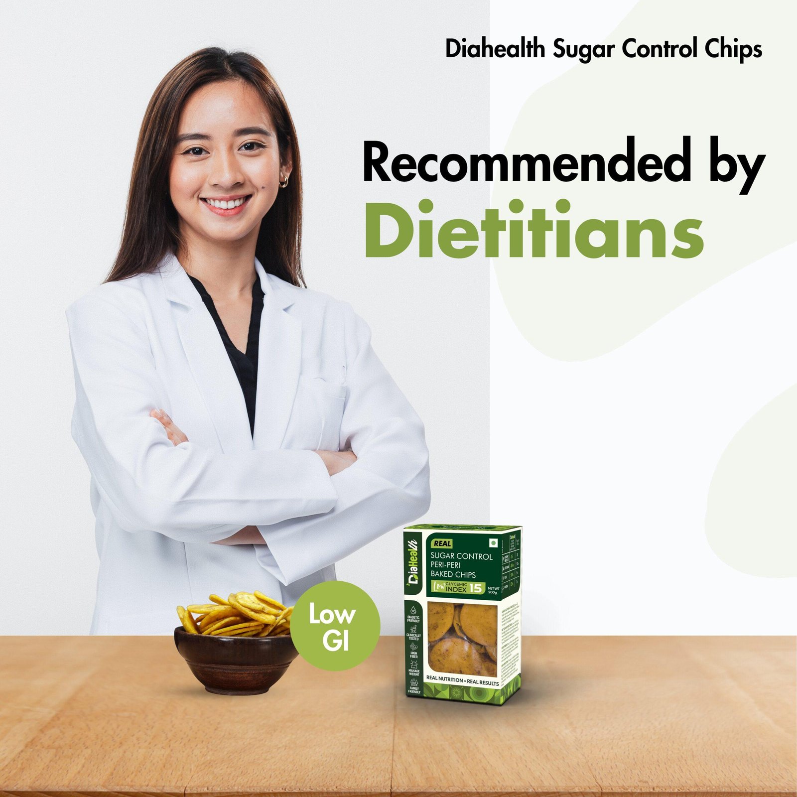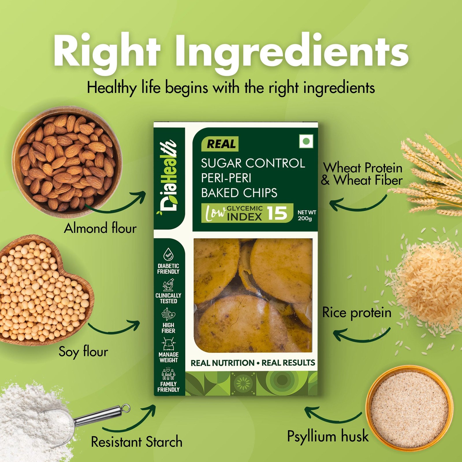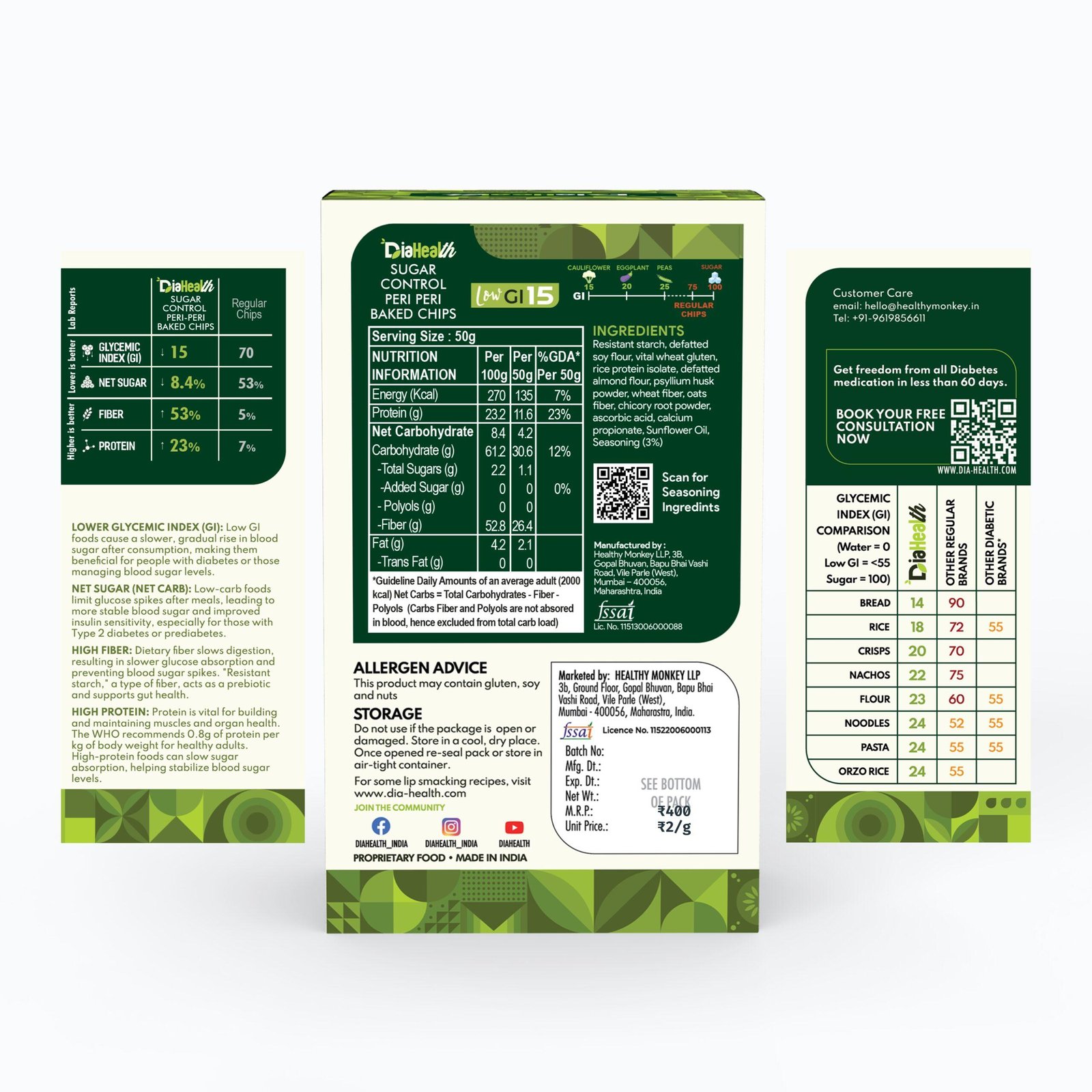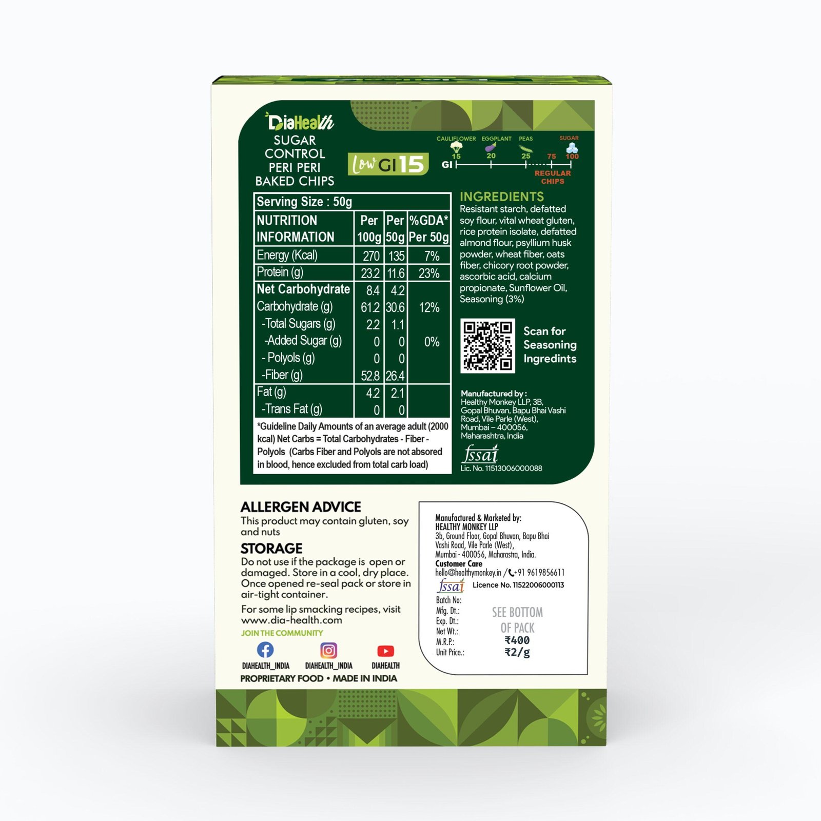 - TASTE IDENTICAL : Diahealth Sugar Control Peri-Peri Baked Chips is taste Identical to Regular Chips. We work hard to ensure that you can enjoy yourself even on a low-carb lifestyle without compromising on taste.